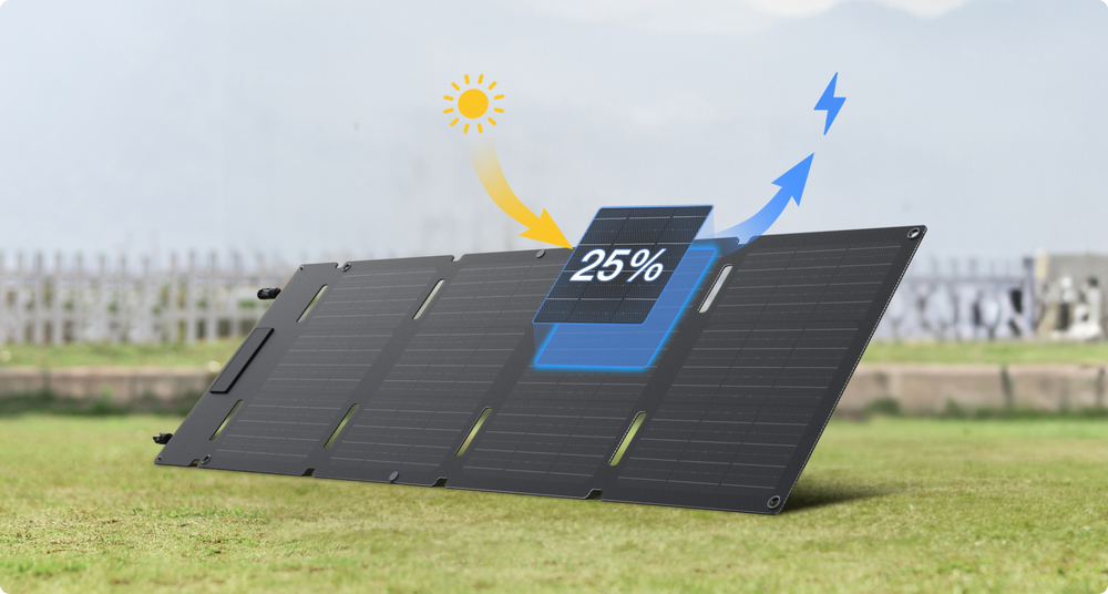 태양광 기술을 도입하여 변환 효율의 새로운 기준을 세웠습니다. 25%의 효율을 달성하여 더 작은 형태로도 더 빠른 충전을 가능하게 합니다. 최적의 일조 시간에 RIVER 2를 7시간 내에 완전히 충전하여 전자기기와 캠핑 장비를 더 오래 사용할 수 있습니다.
