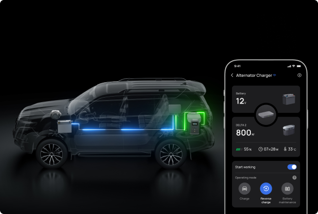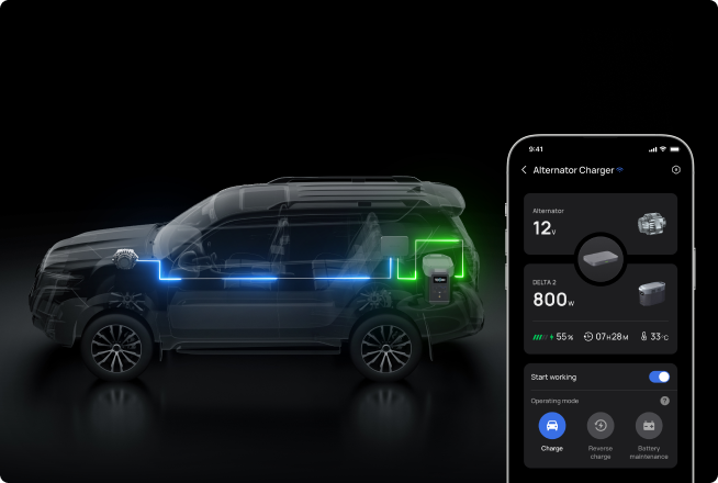 -800W 터보 얼터네이터로 기존 차량 보조 전원 콘센트보다 8배 빠르게 충전가능하며 1.3시간 만에 1kWh를 충전합니다.