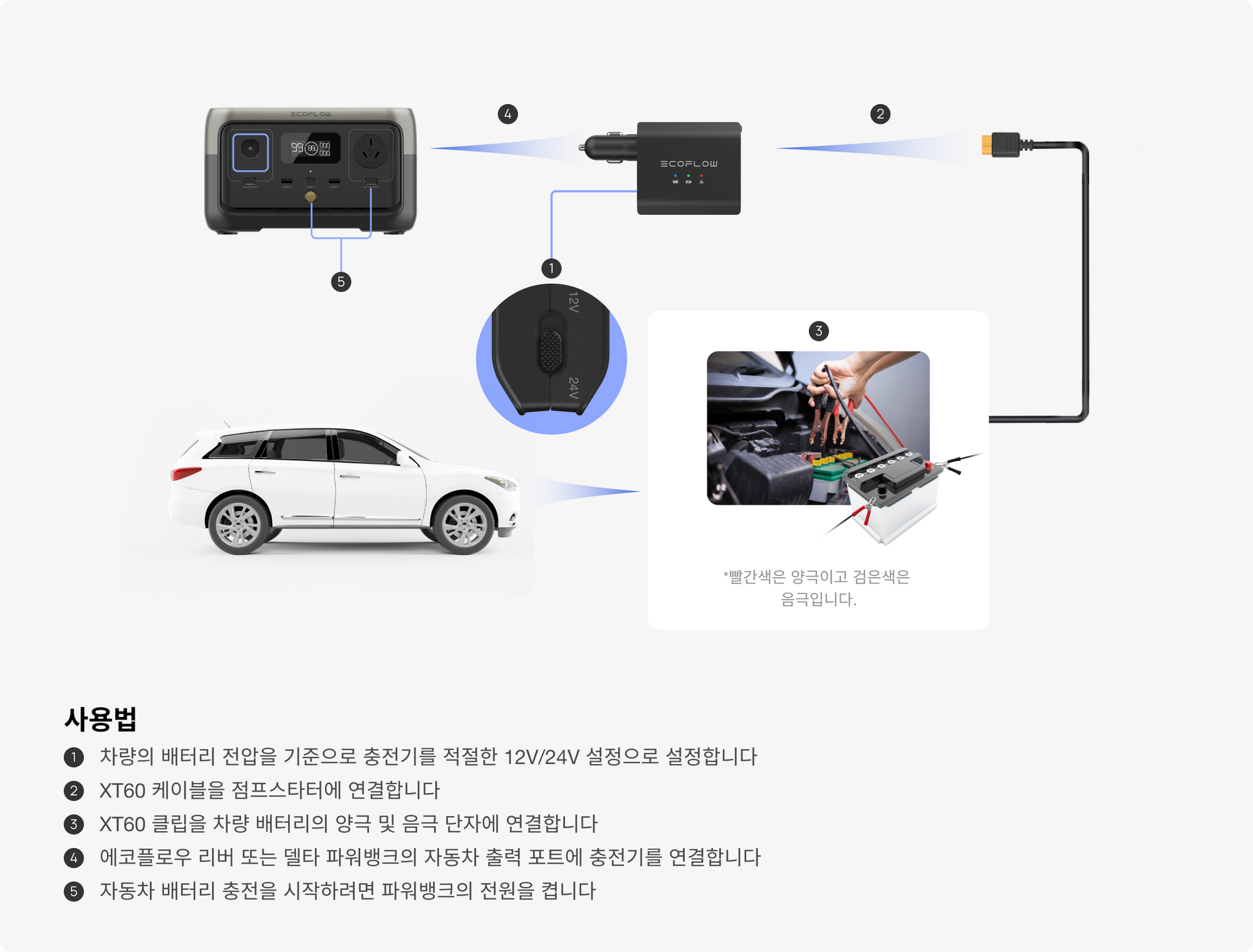 *충전 시간은 12V 차량의 경우 약 20분, 24V 차량의 경우 약 40분입니다.