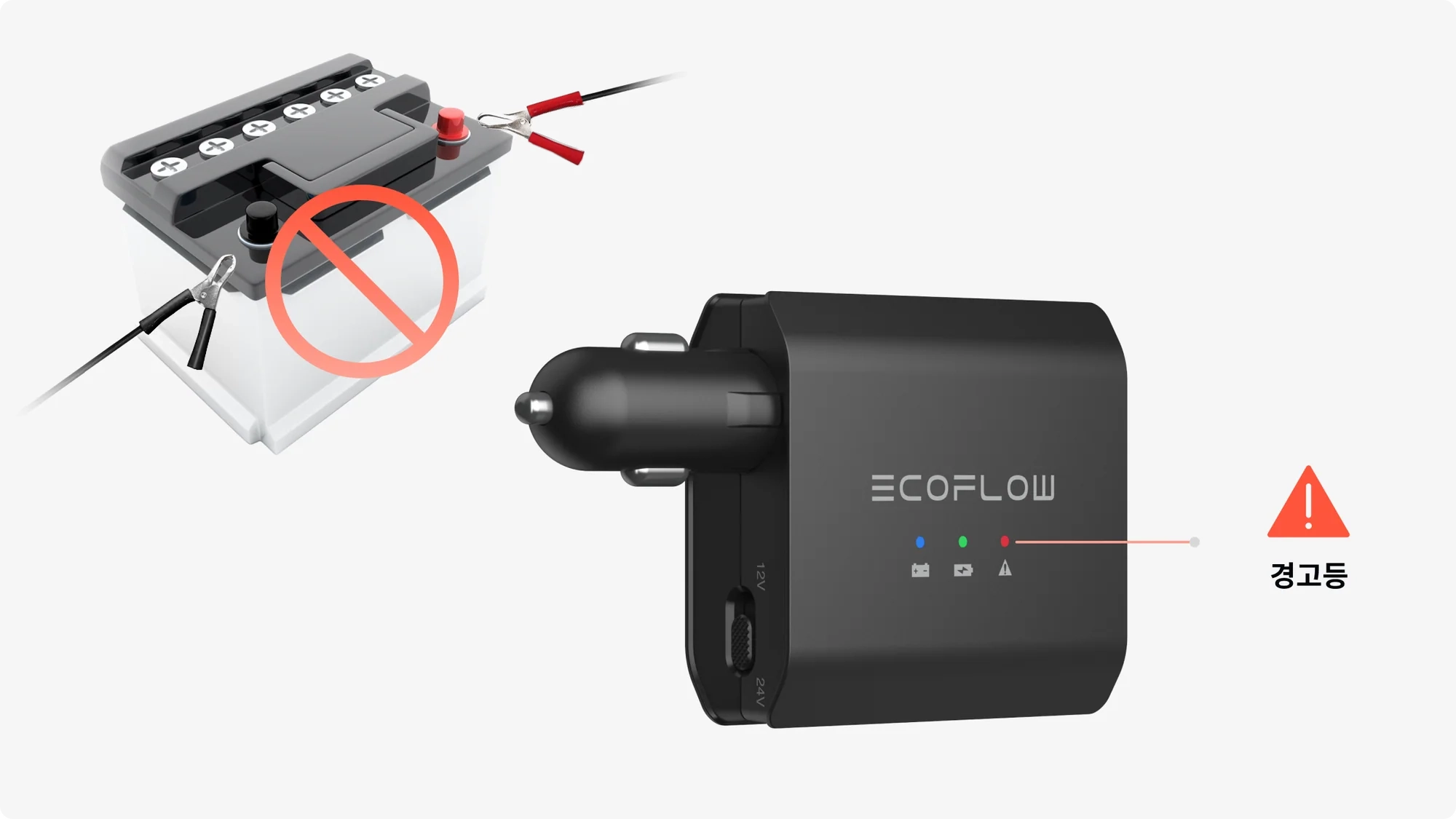배터리 클립이 반대로 연결된 경우 안전 기능이 충전을 중지합니다. 배터리가 안전하게 보호되도록 빨간색 경고등이 켜집니다.